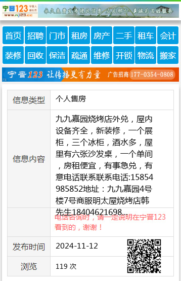 九九嘉园烧烤店外兑,屋内设备齐全,新装修,一个展柜,三个冰柜,酒水多,屋里有六张沙发桌,一个单间,房租便宜,有事急兑,有意电话联系联系电话:15854985852地址:九九嘉园4号楼7号商服明太屋烧烤店韩先生18404621698 【电话咨询时,请一定说明在七台河信息网看到的,谢谢!】 |