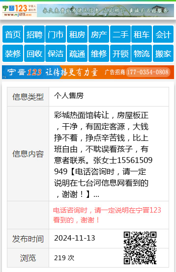 彩城热面馆转让,房屋板正,干净,有固定客源,大钱挣不着,挣点辛苦钱,比上班自由,不耽误看孩子,有意者联系。张女士15561509949 【电话咨询时,请一定说明在七台河信息网看到的,谢谢!】 |