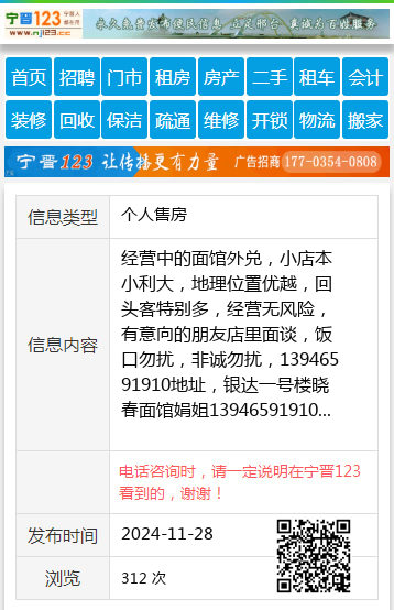 经营中的面馆外兑,小店本小利大,地理位置优越,回头客特别多,经营无风险,有意向的朋友店里面谈,饭口勿扰,非诚勿扰,13946591910地址,银达一号楼晓春面馆娟姐13946591910 【电话咨询时,请一定说明在七台河信息网看到的,谢谢!】 |