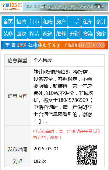 转让欧洲新城28号楼饭店,设备齐全,客源稳定,不需要厨师,新装修,带一年房费外兑10W,不讲价,非诚勿扰。杨女士18045786969 【电话咨询时,请一定说明在七台河信息网看到的,谢谢!】 |