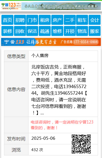 北岸饭店吉兑,正街商服,六十平方,黄金地段格局好,费用低,酒水充足,无需二次投资,电话13946557244。胡先生13946557244 【电话咨询时,请一定说明在七台河信息网看到的,谢谢!】 |