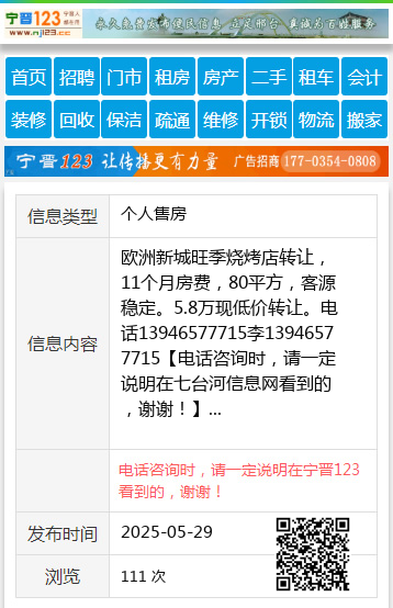 欧洲新城旺季烧烤店转让,11个月房费,80平方,客源稳定。5.8万现低价转让。电话13946577715李13946577715 【电话咨询时,请一定说明在七台河信息网看到的,谢谢!】 |