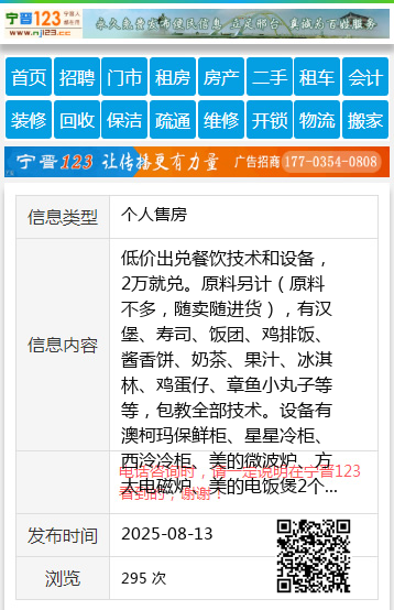 低价出兑餐饮技术和设备,2万就兑。原料另计(原料不多,随卖随进货),有汉堡、寿司、饭团、鸡排饭、酱香饼、奶茶、果汁、冰淇林、鸡蛋仔、章鱼小丸子等等,包教全部技术。设备有澳柯玛保鲜柜、星星冷柜、西泠冷柜、美的微波炉、方太电磁炉、美的电饭煲2个、电炸锅2个、消毒柜、筷子机、小型制冰机、冰淇淋机、煎锅、炒锅、吧台(长2米、宽0.6米、高1.13米)、大小8张桌子和椅子、凳子。非诚勿扰。青女士17713357193 【电话咨询时,请一定说明在七台河信息网看到的,谢谢!】 |