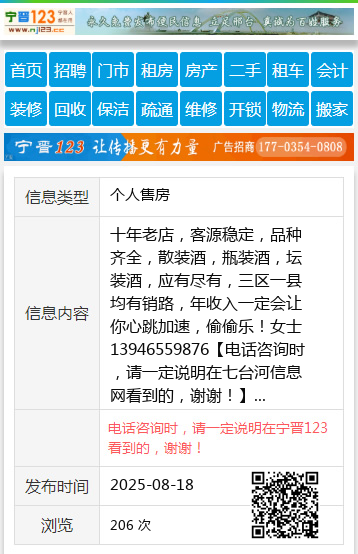十年老店,客源稳定,品种齐全,散装酒,瓶装酒,坛装酒,应有尽有,三区一县均有销路,年收入一定会让你心跳加速,偷偷乐!女士13946559876 【电话咨询时,请一定说明在七台河信息网看到的,谢谢!】 |