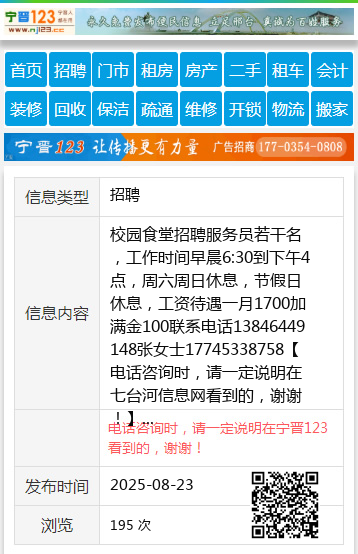 校园食堂招聘服务员若干名,工作时间早晨6:30到下午4点,周六周日休息,节假日休息,工资待遇一月1700加满金100联系电话13846449148张女士17745338758 【电话咨询时,请一定说明在七台河信息网看到的,谢谢!】 |