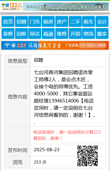 七台河昌河集团招聘退休零工师傅2人,是会点木匠,会接个电的师傅优先。工资4000-5000,其它事宜面议颜经理13946514006 【电话咨询时,请一定说明在七台河信息网看到的,谢谢!】 |