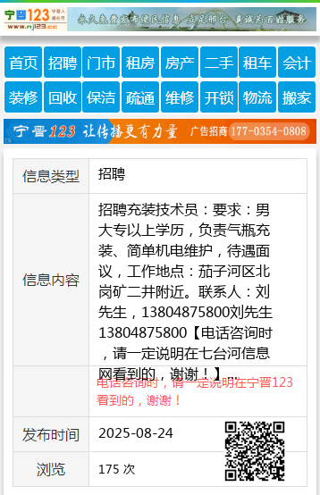 招聘充装技术员:要求:男大专以上学历,负责气瓶充装、简单机电维护,待遇面议,工作地点:茄子河区北岗矿二井附近。联系人:刘先生,13804875800刘先生13804875800 【电话咨询时,请一定说明在七台河信息网看到的,谢谢!】 |