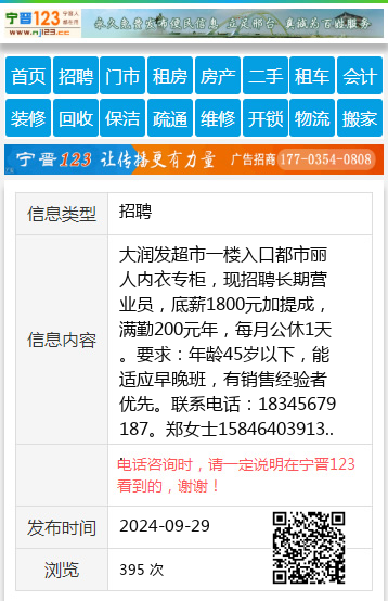 大润发超市一楼入口都市丽人内衣专柜,现招聘长期营业员,底薪1800元加提成,满勤200元年,每月公休1天。要求:年龄45岁以下,能适应早晚班,有销售经验者优先。联系电话:18345679187。郑女士15846403913 【电话咨询时,请一定说明在七台河信息网看到的,谢谢!】 |