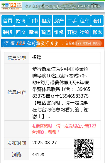 | 防骗提醒: | 七台河信息网(www.qitaihe.cc)提醒您:手工活、网络兼职、刷单,都是骗子!凡以各种名义收取费用的都是骗子!找工作是往兜里挣钱,让你往外掏钱的都是骗子!异地招聘请提高警惕,谨防诈骗! |