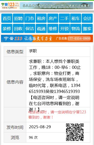 求兼职:本人想找个兼职类工作,晚18:00-早6:00止,求职意向:物业打更,商场保安,洗车场夜班刷车,临时代驾,联系电话,13946519393吴俊13946519393 【电话咨询时,请一定说明在七台河信息网看到的,谢谢!】 |