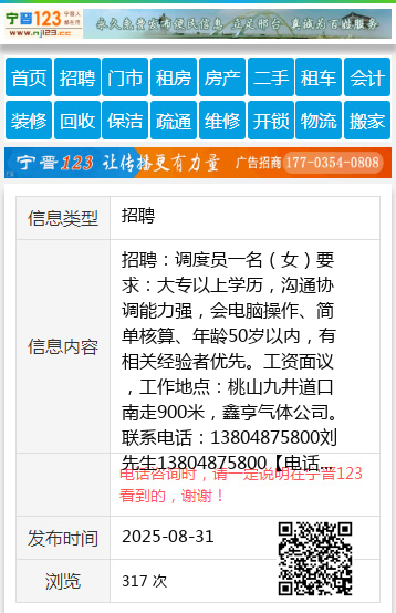 招聘:调度员一名(女)要求:大专以上学历,沟通协调能力强,会电脑操作、简单核算、年龄50岁以内,有相关经验者优先。工资面议,工作地点:桃山九井道口南走900米,鑫亨气体公司。联系电话:13804875800刘先生13804875800 【电话咨询时,请一定说明在七台河信息网看到的,谢谢!】 |