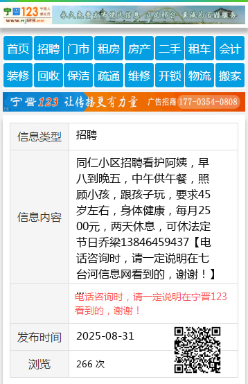 同仁小区招聘看护阿姨,早八到晚五,中午供午餐,照顾小孩,跟孩子玩,要求45岁左右,身体健康,每月2500元,两天休息,可休法定节日乔梁13846459437 【电话咨询时,请一定说明在七台河信息网看到的,谢谢!】 |