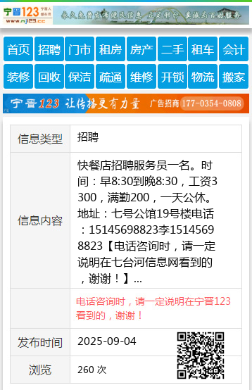 快餐店招聘服务员一名。时间:早8:30到晚8:30,工资3300,满勤200,一天公休。地址:七号公馆19号楼电话:15145698823李15145698823 【电话咨询时,请一定说明在七台河信息网看到的,谢谢!】 |