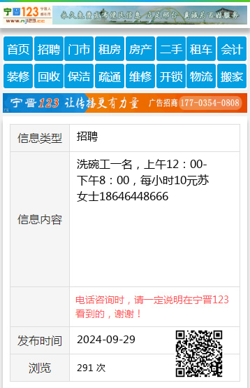 洗碗工一名,上午12:00-下午8:00,每小时10元苏女士18646448666