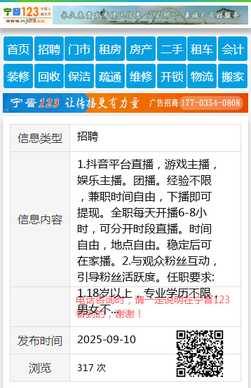 1.抖音平台直播,游戏主播,娱乐主播。团播。经验不限,兼职时间自由,下播即可提现。全职每天开播6-8小时,可分开时段直播。时间自由,地点自由。稳定后可在家播。2.与观众粉丝互动,引导粉丝活跃度。任职要求:1.18岁以上,专业学历不限,男女不限。2.活泼外向、有无经验均可,接受新人小白,宝妈群体(直播美颜功能强大,自信最重要)主播待遇:1、无责保底2k起,可线上可线下,条件优异者保底5k起!团播日结80至300+稳定后送最新iPhone手机!平均收入均在5000至30000!2、有专业经纪团队培训,1至7天内保证上手!提供专业直播设备,场地,提供专业才艺培训不收取任何费用。3、有完善的提成奖励制度,只要你有能力,公司就不会小气!联系电话:19103679191,18304657171(微信同步)李先生18304657171 【电话咨询时,请一定说明在七台河信息网看到的,谢谢!】 |