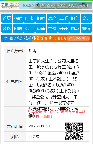 由于扩大生产,公司大量招工:流水线女分拣工2名(30一50岁)底薪2400+满勤300+绩效(上不封顶)+奖金!质检3名(底薪2400+满勤300+绩效(上不封顶)+奖金公司晋升空间大,车间主任,厂长一职等你来,只要你有能力,利丰公司永远给你施展的空间!选择利丰,让你富贵一生!!试用期3天。额满为止!早7:30一16:30中午管饭!厂址:新兴区宝泰隆路26号。公交路线:坐(走葫芦头沟的)1路公交车到(家居广场)站点前走100米恒阳科技公司红大门院内。☎️13946506087王总13946506087 【电话咨询时,请一定说明在七台河信息网看到的,谢谢!】 |