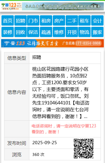 桃山区花园路建行花园小区热面招聘服务员,10点到2点,工资1200.要求女50岁以下,主要烫面和零活,有无经验均可,饭口勿扰。刘先生19104644101 【电话咨询时,请一定说明在七台河信息网看到的,谢谢!】 |