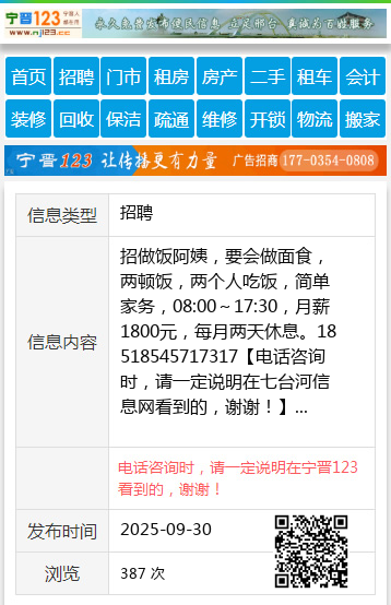 招做饭阿姨,要会做面食,两顿饭,两个人吃饭,简单家务,08:00~17:30,月薪1800元,每月两天休息。18518545717317 【电话咨询时,请一定说明在七台河信息网看到的,谢谢!】 |