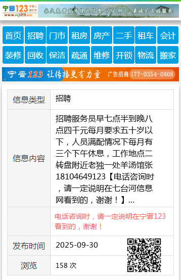 招聘服务员早七点半到晚八点四千元每月要求五十岁以下,人员满配情况下每月有三个下午休息,工作地点二转盘附近老独一处羊汤馆张18104649123 【电话咨询时,请一定说明在七台河信息网看到的,谢谢!】 |