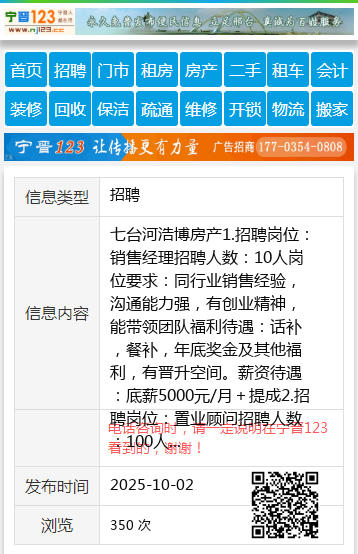 七台河浩博房产1.招聘岗位:销售经理招聘人数:10人岗位要求:同行业销售经验,沟通能力强,有创业精神,能带领团队福利待遇:话补,餐补,年底奖金及其他福利,有晋升空间。薪资待遇:底薪5000元/月+提成2.招聘岗位:置业顾问招聘人数:100人岗位要求:良好的亲和力和服务意识、沟通能力和逻辑思维能力佳;敏锐的洞察力,做事认真踏实,为人正直诚恳,具有良好的团队精神,有强烈的上进心。福利待遇:话补,餐补,年底奖金及其他福利,有晋升空间。薪资待遇:底薪3000元/月+提成联系人:刘经理联系电话:13946539999工作地点:浩博房产十九部(欧洲新城店)个人13946539999 【电话咨询时,请一定说明在七台河信息网看到的,谢谢!】 |