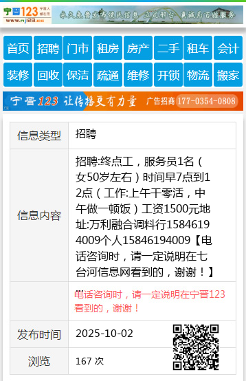 招聘:终点工,服务员1名(女50岁左右)时间早7点到12点(工作:上午干零活,中午做一顿饭)工资1500元地址:万利融合调料行15846194009个人15846194009 【电话咨询时,请一定说明在七台河信息网看到的,谢谢!】 |