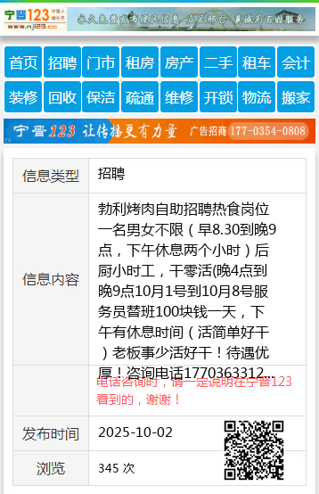 勃利烤肉自助招聘热食岗位一名男女不限(早8.30到晚9点,下午休息两个小时)后厨小时工,干零活(晚4点到晚9点10月1号到10月8号服务员替班100块钱一天,下午有休息时间(活简单好干)老板事少活好干!待遇优厚!咨询电话17703633123饭口勿扰个人17703633123 【电话咨询时,请一定说明在七台河信息网看到的,谢谢!】 |