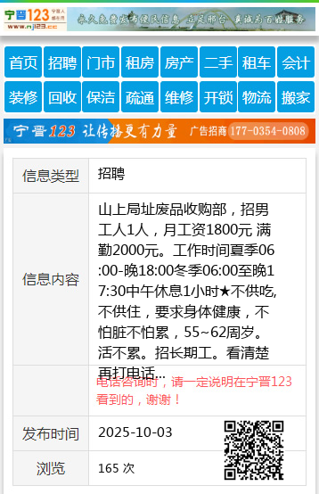 山上局址废品收购部,招男工人1人,月工资1800元 满勤2000元。工作时间夏季06:00-晚18:00冬季06:00至晚17:30中午休息1小时★不供吃,不供住,要求身体健康,不怕脏不怕累,55~62周岁。活不累。招长期工。看清楚再打电话。电话:13089545551个人13089545551 【电话咨询时,请一定说明在七台河信息网看到的,谢谢!】 |