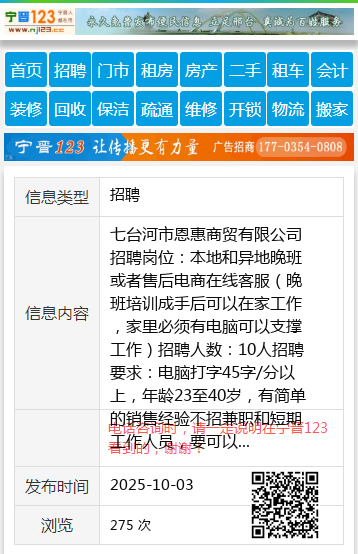 七台河市恩惠商贸有限公司招聘岗位:本地和异地晚班或者售后电商在线客服(晚班培训成手后可以在家工作,家里必须有电脑可以支撑工作)招聘人数:10人招聘要求:电脑打字45字/分以上,年龄23至40岁,有简单的销售经验不招兼职和短期工作人员,要可以长期做的,不要短期工。联系电话15204647438(微信同步)胡女士15204647438 【电话咨询时,请一定说明在七台河信息网看到的,谢谢!】 |