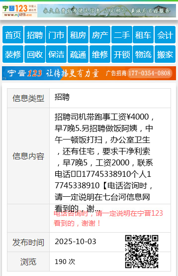 招聘司机带跑事工资¥4000,早7晚5.另招聘做饭阿姨,中午一顿饭打扫,办公室卫生,还有住宅,要求干净利索,早7晚5,工资2000,联系电话☎️17745338910个人17745338910 【电话咨询时,请一定说明在七台河信息网看到的,谢谢!】 |