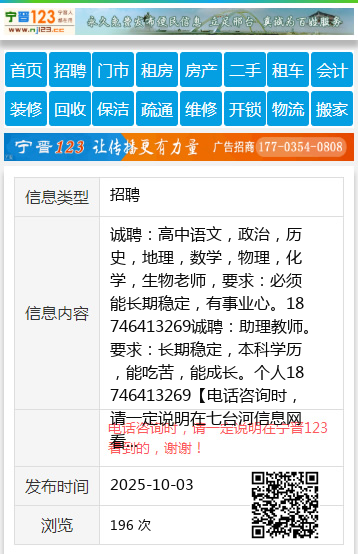 诚聘:高中语文,政治,历史,地理,数学,物理,化学,生物老师,要求:必须能长期稳定,有事业心。18746413269诚聘:助理教师。要求:长期稳定,本科学历,能吃苦,能成长。个人18746413269 【电话咨询时,请一定说明在七台河信息网看到的,谢谢!】 |