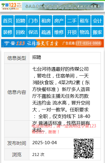 工作地点:茄子河区东方建材城招男主播18646432000 【电话咨询时,请一定说明在七台河信息网看到的,谢谢!】 |