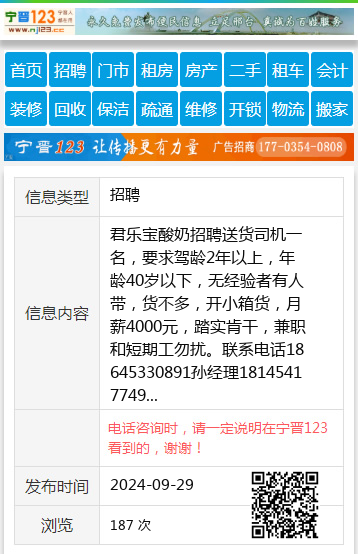 君乐宝酸奶招聘送货司机一名,要求驾龄2年以上,年龄40岁以下,无经验者有人带,货不多,开小箱货,月薪4000元,踏实肯干,兼职和短期工勿扰。联系电话18645330891孙经理18145417749 【电话咨询时,请一定说明在七台河信息网看到的,谢谢!】 |