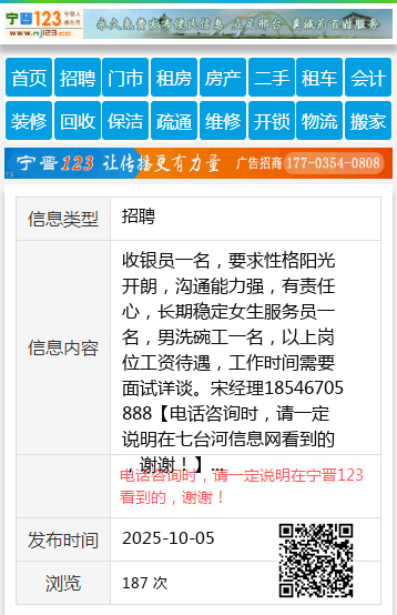 收银员一名,要求性格阳光开朗,沟通能力强,有责任心,长期稳定女生服务员一名,男洗碗工一名,以上岗位工资待遇,工作时间需要面试详谈。宋经理18546705888 【电话咨询时,请一定说明在七台河信息网看到的,谢谢!】 |