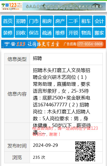 招聘木头打磨工人文员等招聘企业兴研木艺岗位(1)常务助理,直播助理,要求语言形象好,女,25-35待遇:底薪2500+奖金联系电话16744677777(2)招聘岗位:木头打磨工人招聘人数:5人岗位要求:男,身体健康,50岁以下,薪资待遇:3500,节假日休息或加班3倍工资,干满一年给交社保。上班时间早7.00晚4.30中午供饭(3)招聘文员助理*底薪2500满勤200干满一年给交社保,每周日休息,节假日有带薪休,工作时间8.30-16.30午休1小时,公司管午饭-8号开资,主要工作内容:客户电话回访,没任务,能力强有升职空间。要求女-23-40岁之间,会使用基础电脑表格操作,会开车。有车优先。(4)招聘岗位:雕刻师成手木匠老木匠招聘人数:5人岗位要求:根据工艺或客户要求,制作成品,雕刻木艺,成手,成手木匠,老木匠,木匠榫卯结构,雕刻师,会做骨盒小棺材。薪资待遇:面议工作地址:英伦小镇微信电话:19104645511张19104645511 【电话咨询时,请一定说明在七台河信息网看到的,谢谢!】 |
