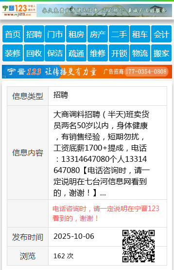 大商调料招聘(半天)班卖货员两名50岁以内,身体健康,有销售经验,短期勿扰,工资底薪1700+提成,电话:13314647080个人13314647080 【电话咨询时,请一定说明在七台河信息网看到的,谢谢!】 |