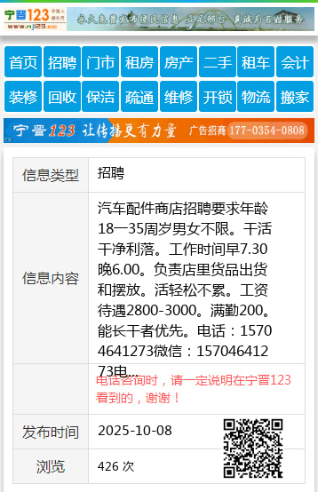 汽车配件商店招聘要求年龄18一35周岁男女不限。干活干净利落。工作时间早7.30晚6.00。负责店里货品出货和摆放。活轻松不累。工资待遇2800-3000。满勤200。能长干者优先。电话:15704641273微信:15704641273电话不通加微信个人15704641273 【电话咨询时,请一定说明在七台河信息网看到的,谢谢!】 |