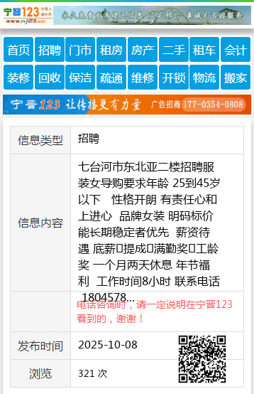 七台河市东北亚二楼招聘服装女导购要求年龄 25到45岁以下 性格开朗 有责任心和上进心 品牌女装 明码标价 能长期稳定者优先 薪资待遇 底薪➕提成➕满勤奖➕工龄奖 一个月两天休息 年节福利 工作时间8小时 联系电话 18045780578个人18045780578 【电话咨询时,请一定说明在七台河信息网看到的,谢谢!】 |