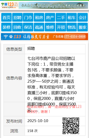 七台河市鹿产品公司招聘以下岗位:1,带货男女主播各3名,不要求颜值,不要求身高体重,不要求学历,25岁—-50岁之间;普通话标准,有无经验均可,每天直播三小时,底薪➕提成3500,保底2000,直播六小时底薪➕提成6000,保底3500元, 2,直播间中控(直播间助理):男女均可,25—45岁,熟练掌握电脑,会平面设计者优先,底薪:2300+车饭补=2600--3500元,超出工作时间加薪面议;无学历,身高体重等其他要求,只要你努力;3,拍摄剪辑人员2人,男女不限,25--45岁之间,会拍摄剪辑,底薪,3300+车饭补=若干,面试合格定薪资,微信联系电话:17713356607,鹿i,微信注明招聘个人17713356607 【电话咨询时,请一定说明在七台河信息网看到的,谢谢!】 |