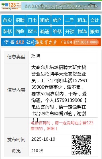 大商允儿烘焙招聘大班卖货营业员招聘半天班卖货营业员,上下午倒班电话15799139906老板事少,活不累,要求52周岁以内,干净,爱沟通。个人15799139906 【电话咨询时,请一定说明在七台河信息网看到的,谢谢!】 |