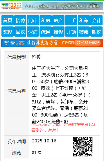 由于扩大生产,公司大量招工:流水线女分拣工2名(30一50岁)底薪2400+满勤300+绩效(上不封顶)+奖金!男工2名(40一58岁)(打包,码垛,装卸车,会开叉车者优先。零活)底薪2100+300满勤)质检3名(底薪2400+满勤300+绩效)公司晋升空间大,车间主任,厂长一职等你来,只要你有能力,利丰公司永远给你施展的空间!选择利丰,让你富贵一生!!试用期3天。额满为止!早7:30一16:30中午管饭!厂址:新兴区宝泰隆路26号。公交路线:坐(走葫芦头沟的)1路公交车到(家居广场)站点前走100米恒阳科技公司红大门院内。☎️13946506087个人13946506087 【电话咨询时,请一定说明在七台河信息网看到的,谢谢!】 |