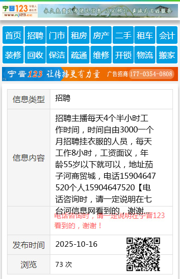 招聘主播每天4个半小时工作时间,时间自由3000一个月招聘挂衣服的人员,每天工作8小时,工资面议,年龄55岁以下就可以,地址茄子河商贸城,电话15904647520个人15904647520 【电话咨询时,请一定说明在七台河信息网看到的,谢谢!】 |