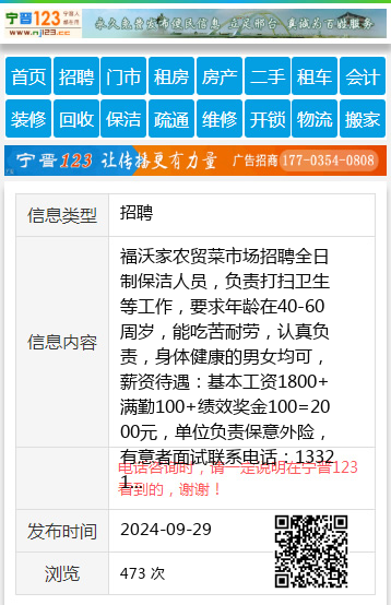 福沃家农贸菜市场招聘全日制保洁人员,负责打扫卫生等工作,要求年龄在40-60周岁,能吃苦耐劳,认真负责,身体健康的男女均可,薪资待遇:基本工资1800+满勤100+绩效奖金100=2000元,单位负责保意外险,有意者面试联系电话:13321488678:15946410211刘经理15946410211 【电话咨询时,请一定说明在七台河信息网看到的,谢谢!】 |
