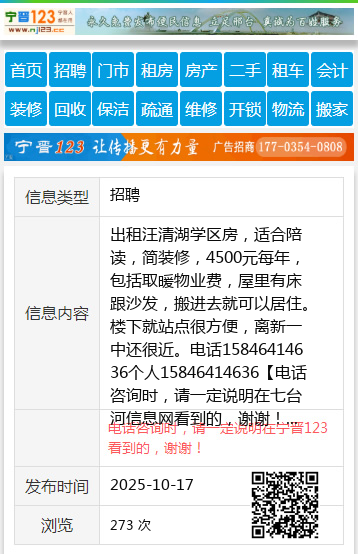 出租汪清湖学区房,适合陪读,简装修,4500元每年,包括取暖物业费,屋里有床跟沙发,搬进去就可以居住。楼下就站点很方便,离新一中还很近。电话15846414636个人15846414636 【电话咨询时,请一定说明在七台河信息网看到的,谢谢!】 |