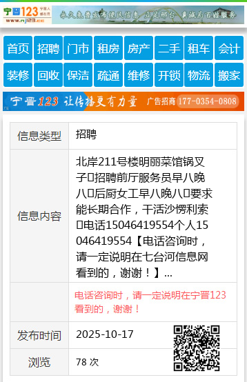 北岸211号楼明丽菜馆锅叉子招聘前厅服务员早八晚八后厨女工早八晚八要求能长期合作,干活沙愣利索电话15046419554个人15046419554 【电话咨询时,请一定说明在七台河信息网看到的,谢谢!】 |