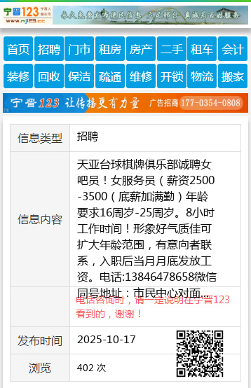 天亚台球棋牌俱乐部诚聘女吧员!女服务员(薪资2500-3500(底薪加满勤)年龄要求16周岁-25周岁。8小时工作时间!形象好气质佳可扩大年龄范围,有意向者联系,入职后当月月底发放工资。电话:13846478658微信同号地址:市民中心对面个人13846478658 【电话咨询时,请一定说明在七台河信息网看到的,谢谢!】 |