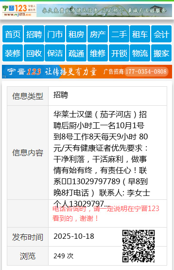 华莱士汉堡(茄子河店)招聘后厨小时工一名10月1号到8号工作8天每天9小时 80元/天有健康证者优先要求:干净利落,干活麻利,做事情有始有终,有责任心!联系☎️13029797789(早8到晚8打电话) 联系人: 李女士个人13029797789 【电话咨询时,请一定说明在七台河信息网看到的,谢谢!】 |