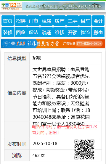 大世界家具招聘:家具导购五名????会剪辑视频者优先薪酬福利:底薪:3000元+提成+高额奖金+带薪休假+节日福利。具备良好的沟通能力和服务意识;无经验者可培训上岗;联系电话:18304604888地址:富康花园东门富一层个人18304604888 【电话咨询时,请一定说明在七台河信息网看到的,谢谢!】 |