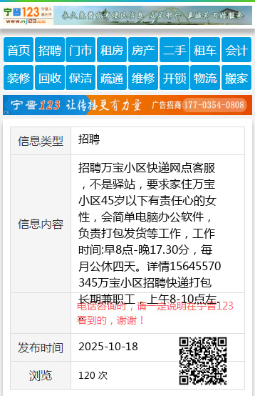 招聘万宝小区快递网点客服,不是驿站,要求家住万宝小区45岁以下有责任心的女性,会简单电脑办公软件,负责打包发货等工作,工作时间:早8点-晚17.30分,每月公休四天。详情15645570345万宝小区招聘快递打包长期兼职工,上午8-10点左右,下午12-14点左右,非诚勿扰,没有休周六周日法定节假日的事。想多挣增加时间就可以。详情15645570345。刘经理15645570345 【电话咨询时,请一定说明在七台河信息网看到的,谢谢!】 |