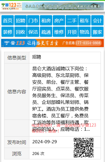 昆仑大酒店诚聘以下岗位:高级厨师、东北菜厨师、保安员、前台、餐厅主管、餐厅迎宾员、点菜员、餐饮服务员服务生、保洁员、传菜员、企划部婚礼策划师、锅炉工。酒店为员工提供免费宿舍楼、员工餐厅,免费员工浴池等各项福利待遇,欢迎你的加入。应聘电话:19903670101李总王女士13946555328 【电话咨询时,请一定说明在七台河信息网看到的,谢谢!】 |