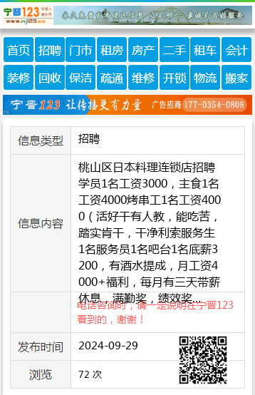桃山区日本料理连锁店招聘学员1名工资3000,主食1名工资4000烤串工1名工资4000(活好干有人教,能吃苦,踏实肯干,干净利索服务生1名服务员1名吧台1名底薪3200,有酒水提成,月工资4000+福利,每月有三天带薪休息,满勤奖,绩效奖,工龄奖,有员工宿舍,行李,无线网,淋浴。电话13115357321微信同步赵先生13089538836 【电话咨询时,请一定说明在七台河信息网看到的,谢谢!】 |